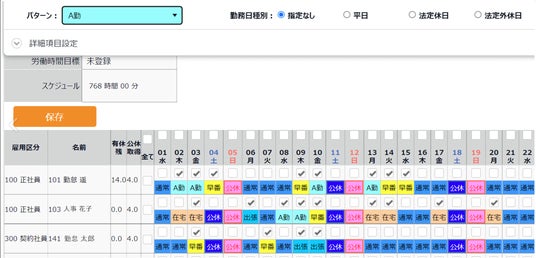 - シフト関連機能時間帯別の必要人数や、従業員の業務習熟度に合わせて、シフトの自動作成ができます。自動作成されたシフトを元に編集ができ、シフト作成作業を大幅に軽減することが可能です。