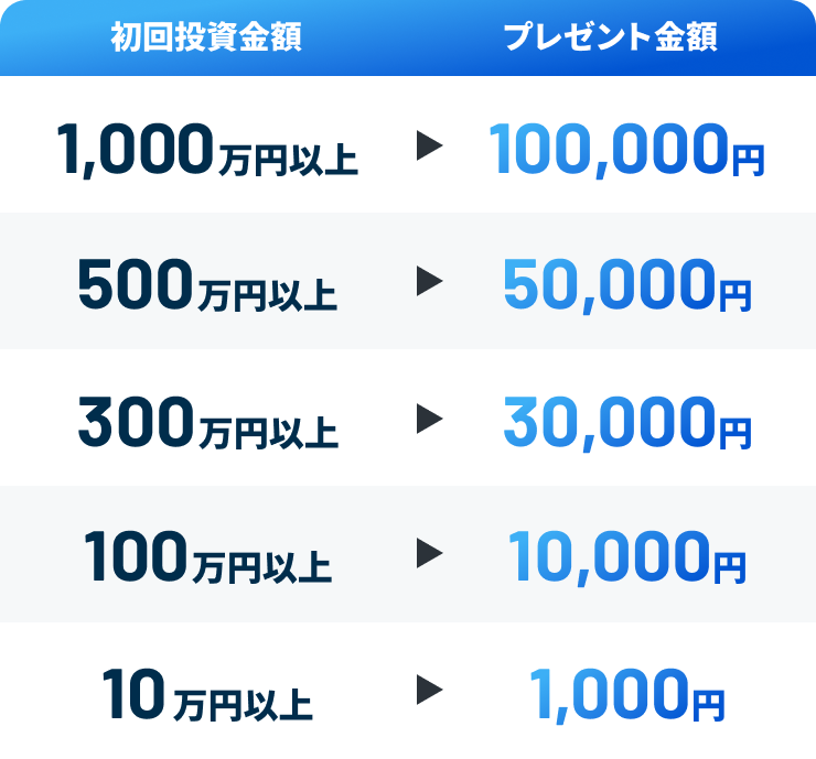 10万円以上の初回投資で、もれなく最大10万円分の残高をプレゼント