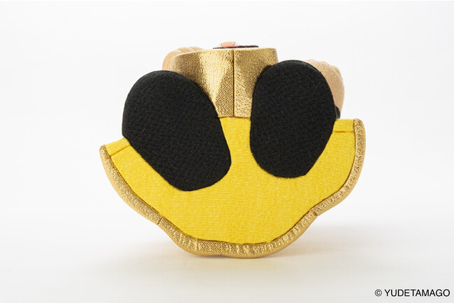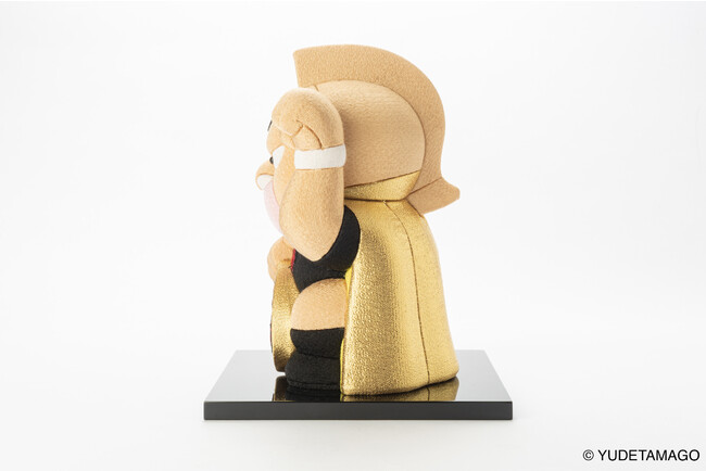 額にはおなじみの「肉」文字、胸元にはキン肉族の証「KINマーク」、右手に抱えた小判には「友情」文字を、それぞれ刺繍で表現しています。