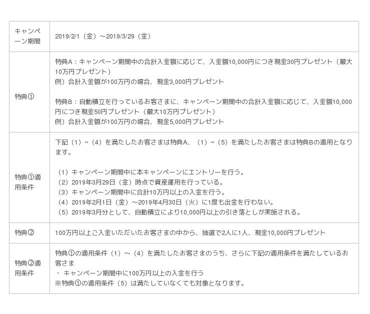 今回のキャンペーン(2月1日~3月29日)では、キャンペーン期間中にエントリーを行い、「WealthNavi for SBI証券」の口座に入金をするなど、条件を満たしたお客さまを対象に最大10万円をプレゼントいたします。