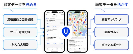 「UPWARD」は、外回り営業に特化した顧客データの記録・活用を効率化するアプリです。顧客データの一元管理、脱属人化・再現性アップ等を目指す営業組織の課題解決に向けて、地図をベースにしたシンプルかつ直感的な機能で、再現性の高い営業活動をサポートします。
