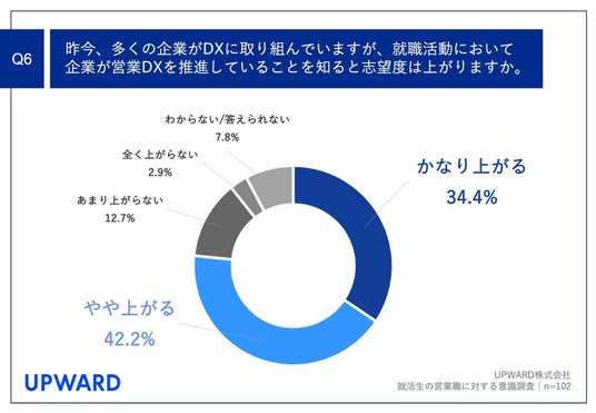 「Q6.昨今、多くの企業がDXに取り組んでいますが、就職活動において企業が営業DXを推進していることを知ると志望度は上がりますか。」(n=102)と質問したところ、「かなり上がる」が34.4%、「やや上がる」が42.2%という回答となりました。