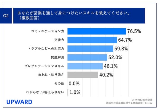 「Q2.あなたが営業を通して身につけたいスキルを教えてください。(複数回答)」(n=102)と質問したところ、「コミュニケーション力」が76.5%、「交渉力」が64.7%、「トラブルなどへの対応力」が59.8%という回答となりました。