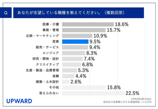 「Q.あなたが志望している職種を教えてください。(複数回答)」(n=5,219)と質問したところ、「医療・介護」が18.6%、「事務・管理」が15.7%、「企画・マーケティング」が10.9%と続き、「営業」は9.5%という回答となりました。