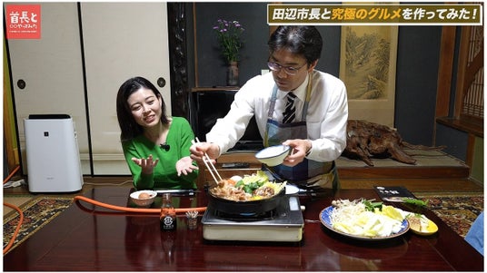 福岡県古賀市を舞台にMCの久下真以子アナウンサー(セントフォース所属)が田辺一城(たなべかずき)市長と「名物・鶏すきをつくってみた」と料理に挑戦しました