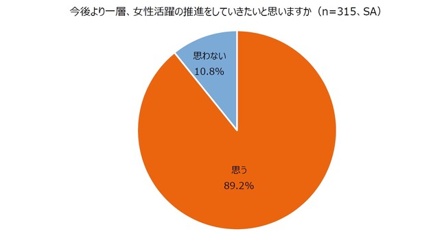 中小企業経営者315名に、より一層の女性活躍を推進したいか聞いたところ、推進していきたいと「思う」が約9割(89.2%)となりました。