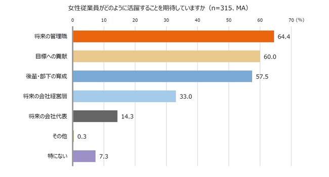 自社の女性従業員に期待することを聞いたところ、最も高かったのは、「将来の管理職」(64.4%)で、次いで、売上達成など部署の「目標への貢献」(60.0%)、「部下・後輩の育成」(57.5%)、「将来の会社経営層」(33.0%)となりました。目標達成や、部下・後輩育成などの部署の中心的な役割や、管理職、そして会社経営層になることを期待している経営者がいることがうかがえます。