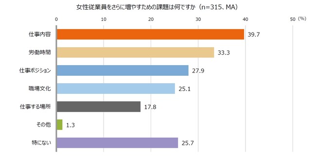 また、中小企業経営者315名に、さらに女性従業員を増やすための課題を聞いたところ、「仕事内容」が最多の39.7%となり、次いで、「労働時間」(33.3%)、「仕事ポジション」(27.9%)となりました。また、「特にない」という回答も25.7%でした。