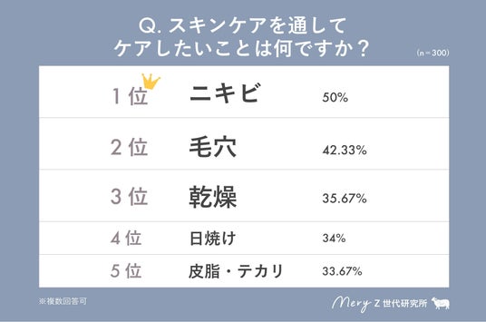 「スキンケアを通してケアしたいこと」では、1位の「ニキビ」(50%)に次いで、2位に「毛穴」(42.33%)がランクインした。「皮脂・テカリ」は33.67%で5位となり、Z世代男性は皮脂のケアよりも毛穴のケアを行っている人が多いことがわかった。
