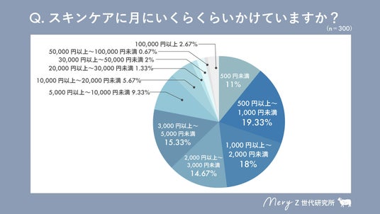 「月のスキンケアにかける金額」は、1位「500円以上~1,000円未満」(19.33%)、2位「1,000円以上~2,000円未満」(18%)、3位「3,000円以上~5,000円未満」(15%)という結果に。
