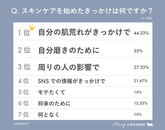 「スキンケアを始めたきっかけ」については、「自分の肌荒れがきっかけで」と回答した人が44.33%で1位、次いで「自分磨きのために」(35%)が2位、「周りの人の影響で」(27.33%)が3位という結果となった。