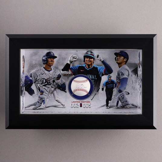 博物館品質のコレクション保護用フレームは、壁掛け用に設計され、チームのユニフォームデザインに合わせた実際のユニフォームと、日本が誇る二刀流スーパースターの力強いサインが施されています。