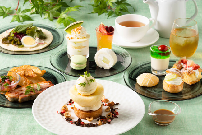 見た目もおいしいスイーツは「パフェ風メロンショートケーキ」、「メロンソーダ風パンナコッタ」、「桃のシフォンケーキ」などをご用意。