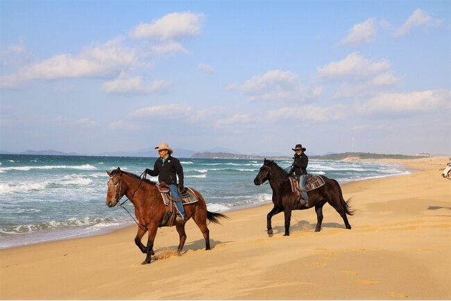 ココペリウエスタンライディング小学生の1人乗りや未就学児と大人の2人乗りも可能なホースライディング。林の中や玄界灘の砂浜など、自然を感じながら乗馬ができ、初心者にも上級者にも好評。