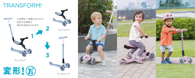 ゴーアップは工具不要で3つのモードに変形し、トドラーからキッズまで長くお使いいただけるキックスクーターシリーズです。2020年の日本発売以降、多くのファミリーにご愛用いただいています。
