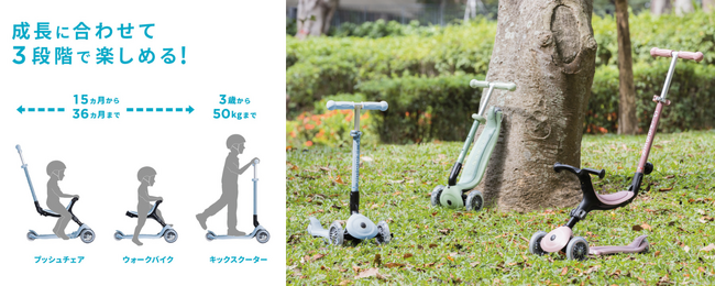 3段階のモードチェンジで、15カ月から50kgまで長く楽しめるキックスクーター。バランスが安定する三輪タイプは、バランスが安定して小さなお子さまでも転びにくい。乗り物おもちゃデビューにおすすめです。