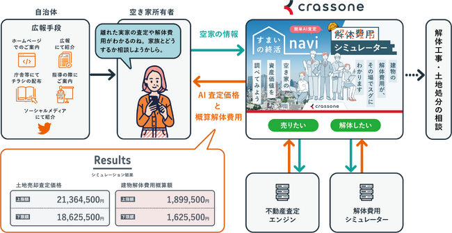 スマートフォン等から土地建物の面積や最寄り駅、接する道の幅などの条件を入力することで、「解体費用」と解体後の「土地売却査定価格」の概算額を手軽に無料で把握することができ、「解体費用がどのくらいか分からない」といった情報不足の解消や、解体後の土地売却の見通しが立たないために空き家の解体に踏み切れない所有者の意思決定の後押しを行います。算出にあたっては、市内の解体相場や市場価格などの地域性が反映されおり、結果ページでは西尾市の解体工事に関する補助金情報も確認することが可能です。