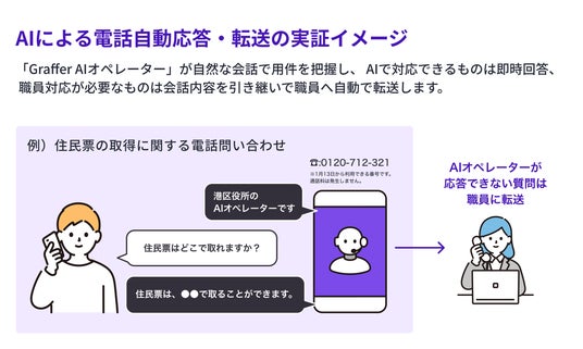 株式会社グラファー(本社:東京都渋谷区、代表取締役:石井大地、以下「グラファー」)は、東京都港区(区長:清家 愛、以下「港区」)が1月13日より、AIエージェントの高度な会話能力を活用した電話応答サービス「人と生成AIの協働による、区役所の電話応対のDX」の実証実験を開始したことをお知らせいたします。本実験では、住民票・戸籍・マイナンバーカード等、区民課の幅広い問い合わせに対してAIが自動回答や職員への転送を実施。AIによる迅速な案内による区民サービス向上と職員の負荷軽減を目指します。