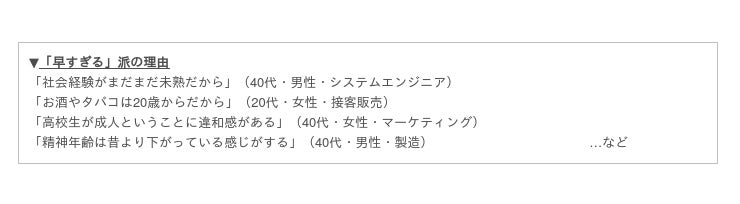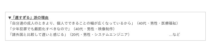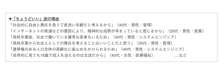 一方、34.0%の人は「早すぎる」と感じていました。理由として、経験不足により判断力、責任能力が成熟していないまま、親の同意を得ずに様々な契約ができることによって、トラブルに巻き込まれる若者が増えるのではないかと危惧する声が挙がりました。また、喫煙や飲酒可能年齢が20歳のままであることとの整合性が取れないことを懸念する人もいました。
