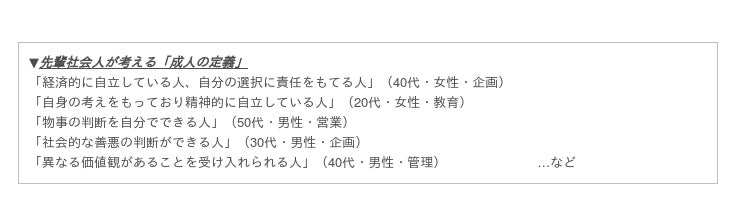 今回の調査から、先輩社会人は、「18歳成人」をちょうどよいと考える人が多く、成人年齢の引き下げに対しても比較的前向きに捉え、期待を寄せていることがわかりました。「大人」とは、「自立や責任感がある人」と考える人も多い中で、今回の成人年齢引き下げが、若者に対してどの程度「自覚」を芽生えさせるきっかけになるのか、今後の新成人の動向から目が離せません。また、すでに成人している人たちにとっても、今年4月から誕生する18歳・19歳の新成人の先輩として、「成人とは何か」、「大人とは何か」、人生を振り返り、考えてみるきっかけになるのではないでしょうか。