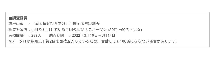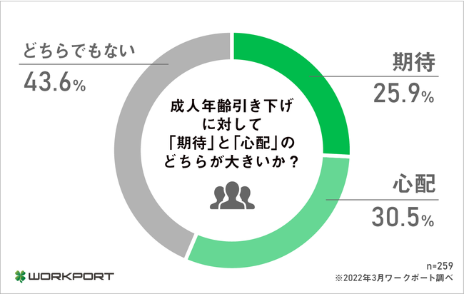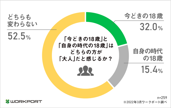 総合転職エージェントの株式会社ワークポート(所在地:東京都品川区、代表取締役社長 CEO:田村高広)は、2022年4月からの成人年齢引き下げに際し、全国のビジネスパーソン259人(20代~60代・男女)に、「成人年齢引き下げ」に関する意識調査を行いました。
