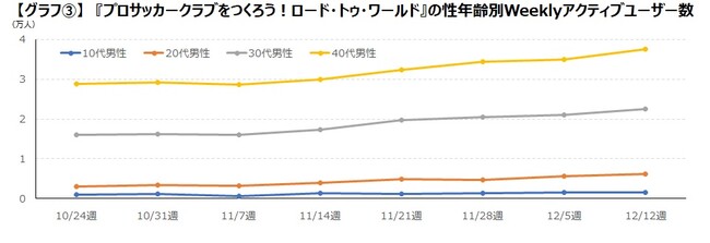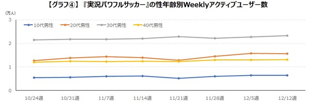 ユーザー数の推移を見ると、ワールドカップが開催された11月14日週から、ユーザー数が増加していますが、その増加率は比較的緩やかなものとなっています。ユーザー数の増加が目立つのは40代と30代の男性で、『eFootball™ 2023』で増加が目立った10代男性の変化はほとんど見られませんでした。【グラフ3.】