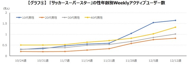 ワールドカップ付近からユーザー数を伸ばし、特に11月28日週から大幅にユーザー数が増加し、12月12日週には平時の約6倍に増加しました。その中でも特に10代男性が増加していることがわかります。【グラフ5.】