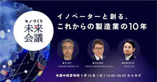 当日は、DENSO CORPORATIONのDirector 伊東貴博氏、Yasukawa AmericaのVice President 原英則氏、CADDi CEOの加藤勇志郎の登壇が決定し、当イベント冒頭では柳淳 在シカゴ総領事によるご挨拶もいただく予定です。 製造業界の第一線で活躍する在米日系企業の方々から、アメリカにおける製造業の最前線についてお話いただきます。登壇者は今後も随時追加予定です。