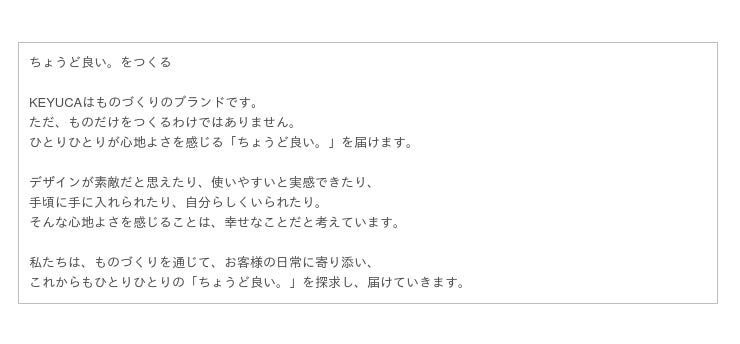 お客様にとっての「ちょうど良い。をつくる」ブランドとして、ものづくりを通して、日々の暮らしを心地よいものにしていきます。
