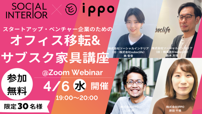 スタートアップ・ベンチャー企業に特化したオフィス仲介業務と不動産サービスを展開する株式会社IPPO(東京都渋谷区 代表取締役社長:関口秀人 以下IPPO)は、2022年4月6日(水)に『スタートアップのためのオフィス移転&サブスク家具講座』としてオンラインセミナーを開催いたします。
