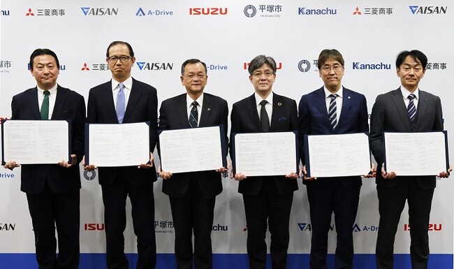 (写真左より、A-Drive(株) 岡部社長、三菱商事(株) 高井本部長、平塚市 落合市長、神奈川中央交通(株) 今井社長、アイサンテクノロジー(株) 佐藤本部長、いすゞ自動車(株) 佐藤執行役員)
