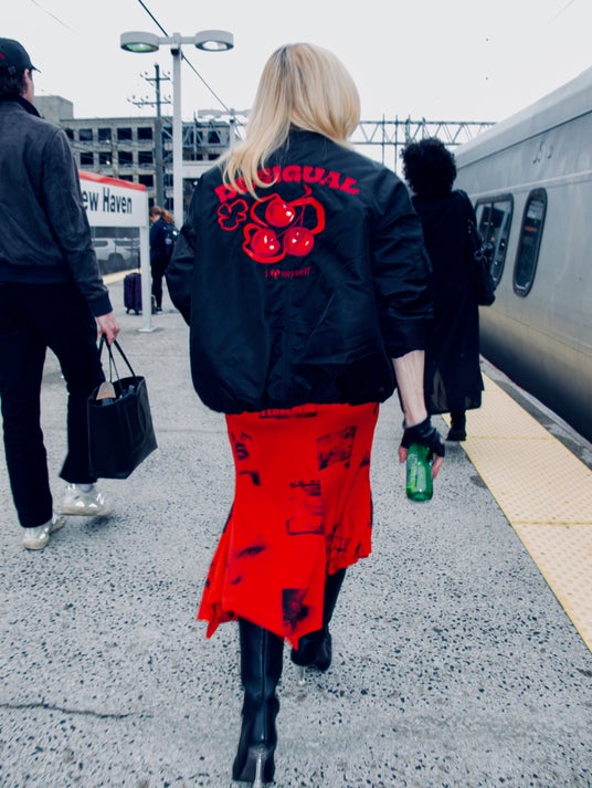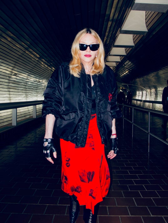 『Like a Virgin』、『Music』、『Vogue』などの数々の楽曲で知られる彼女は、左前面と背中にチェリーの刺繍が施された黒のボンバージャケットに、「I love who I am」などのメッセージとキスのプリントが施された赤のミディスカートを着用。このセレクションは、彼女がそのキャリアを通して体現してきた個人的な解放と自己愛に完璧に合致しています。