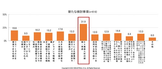 今後の新たな検討事項は、昨年同様「DX推進人材の確保・育成」31.9%、「リモートでDXを推進できる仕組み」19.6%、3位は「大きな投資が不要なDXの仕組み」17.6%となりました。