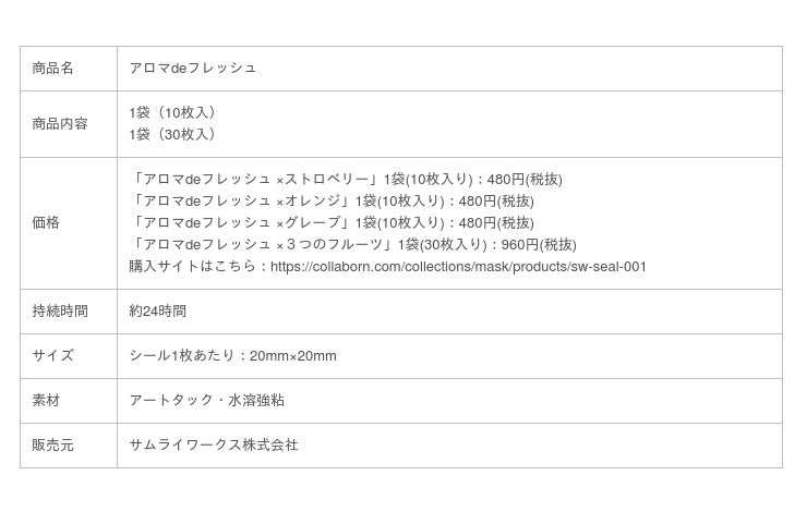 マスクは新しい生活スタイルに欠かせない生活必需品のひとつとなりました。一方で、マスクをしたときのにおいや息苦しさなどの、着用時の不快感にストレスを抱く方は少なくありません。そこで、サムライワークス株式会社(代表取締役社長:新島 実 本社所在地:東京都渋谷区)では、マスクのお悩みをアロマのチカラでサポートするために、いつでもどこでも香りを楽しむ!マスクに貼るアロマの香りシール「アロマdeフレッシュ」を新発売致します。「アロマの香りシール」は今お持ちのマスクの内側、外側お好きなところに貼るだけで、1日中、手軽に、清潔に香りを楽しめるアイテムで、マスクから直接香りが漂い快適なマスクライフをお過ごしいただけます。
