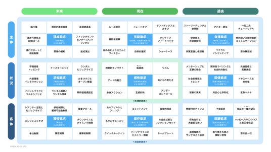 9つに分類した人間の本質的な欲求と、それぞれにアプローチする101種類の体験デザイン手法を整理した、ゲーム開発で培ってきた生活者の心を動かし「ついやってしまう」「ついやりたくなってしまう」「ついやり続けてしまう」体験を生み出すセガXDの独自技術を体系化したフレームワーク「ゲーミフィケーションボード(Oボード)」。そのフレームワークを、学び・活用するために制作したカードです。