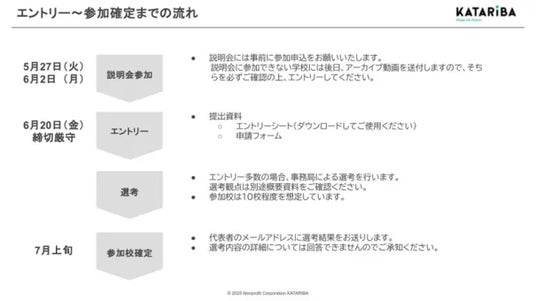 まずは以下に記載の説明会に参加・もしくはアーカイブをご視聴いただいたのち、資料請求いただいた学校の方に応募方法の詳細をお送りいたします。以下フォームよりお申込みください。