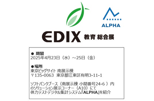 2020年度から体力テストデジタル集計アプリ『ALPHA』(以下、ALPHAという)を展開しているPestalozzi Technology株式会社(本社:東京都、代表取締役社長CEO 井上 友綱)は、2025年4月23日(水)~25日(金)に開催されるEDIX(教育総合展)2025」において、ソフトバンク株式会社(本社:東京都、代表取締役 社長執行役員 兼 CEO 宮川 潤一)の出展ブース内の特設コーナでALPHAを展示・紹介いたします。