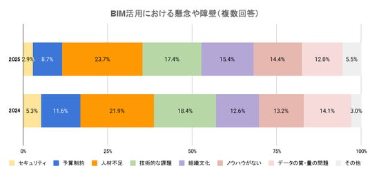 BIM活用における懸念や障壁として最も多く挙げられたのは、「人材不足」(23.7%)で、前年調査(21.9%)よりも増加。BIMの普及に伴い、それを扱える専門人材の育成・確保が喫緊の課題となっています。