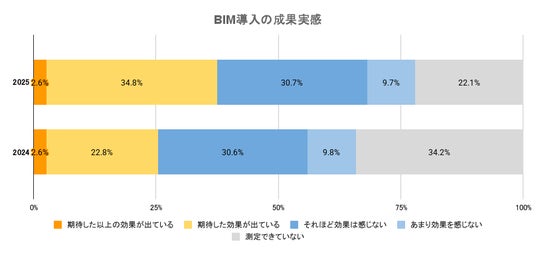 BIM導入企業のうち、「期待した効果が出ている」という回答は22.8%から34.8%へと大幅に増加。導入企業の37.4%が期待通りの、またはそれ以上の効果を実感しており、BIM活用が着実に成果を生み出し始めている様子がうかがえます。