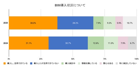 「導入し、活用できている」企業の割合は、2024年の31.1%から2025年には38.0%へと6.9ポイント増加。BIMが建設業界で着実に浸透し、活用フェーズに進んでいることが見て取れます。