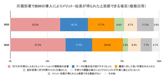 メリット・効果が得られたと実感できる場面では、「3Dでの可視化」が33.5%で最も高い割合を占める一方、「データの整合性が図りやすくなった」が2024年の17.9%から18.7%へと増加。BIMが設計・施工プロセスにおけるデータの統一と活用に貢献し始めていることが伺えます。