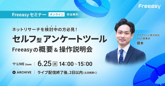全国1,300万人の調査モニターへ、500円からネットリサーチが実施できる、セルフ型アンケートツール“Freeasy(フリージー)”を展開するアイブリッジ株式会社(本社:大阪市福島区、代表取締役社長:荒川和也)は、Freeasyオンラインセミナー『セルフ型アンケートツールFreeasyの概要&操作説明会』を、2025年6月25日(水)14時から開催いたします。
