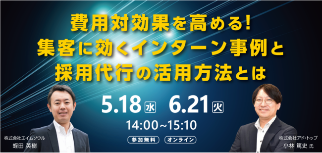 採用支援コンサルティング事業を手掛ける株式会社エイムソウル(本社:東京都品川区、代表取締役:稲垣 隆司)は、採用活動の強化&効率化メソッドを持つ株式会社アド・トップと、2022年5月18日(水)、6月21日(火)に無料WEBセミナーを実施します。本セミナーでは、24卒採用の成功に向けて、効果的なインターンシップの設計方法や採用効率化・KPI改善のポイントについて、事例を交えながら解説いたします。
