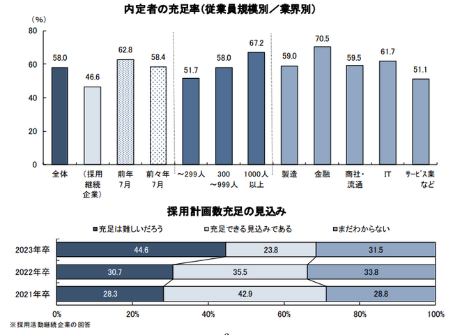 近年、採用市場は売り手市場になり、優秀な人材を得るために新卒採用の競争が激化しています。2023卒の就活が概ね終わっている2022年7月時点の2023卒の内定者充足率を見ると、全体では58.0%、従業員が299人以下の企業では51.7%となっています。