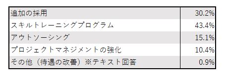 IT技術関連者と経営者の間で、IT人材不足に関する認識に大きな違いはないものの、技術関連者はサービス品質の低下(経営者・役員は38.4%)を最も深刻に感じており、経営者はプロジェクトの遅延(42.5%)をより重要視しています。これらの違いは、彼らが直接的に影響を受ける領域やビジネスの視点に関連している可能性があります。組織内でのコミュニケーションと調整が重要であり、共通の目標に向けた対策の協力が求められます。