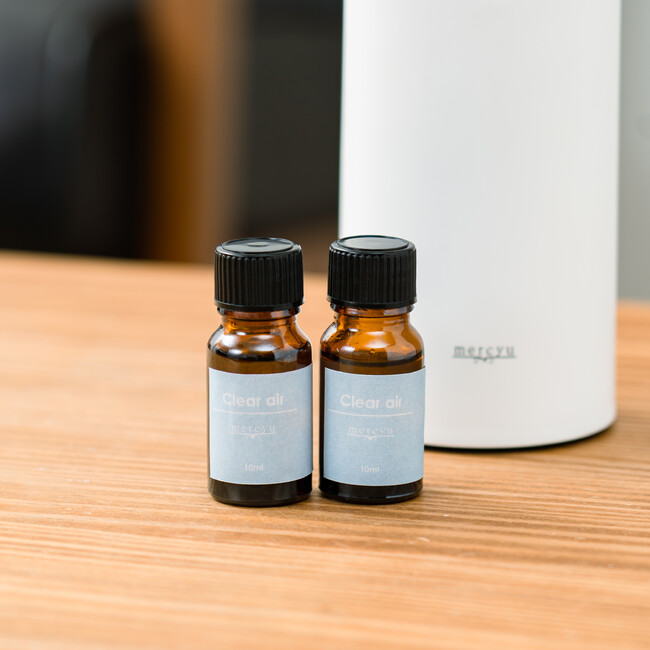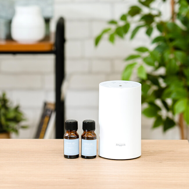 このディフューザー専用アロマオイルとして、mercyu(メルシーユー)で大人気の3つの香りからお気に入りの1種類を2本と本体のセット。