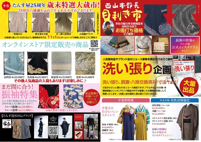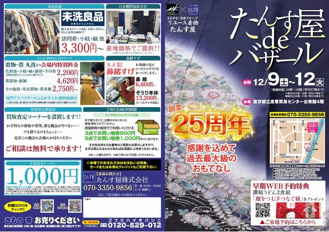 「たんす屋deバザール」は、着物にご興味をお持ちの皆様を心より歓迎いたします。伝統の着物文化を称賛し、環境にやさしいファッションをサポートする「たんす屋」が、25周年を迎えるこの特別な機会に、皆様のご来場をお待ちしております。