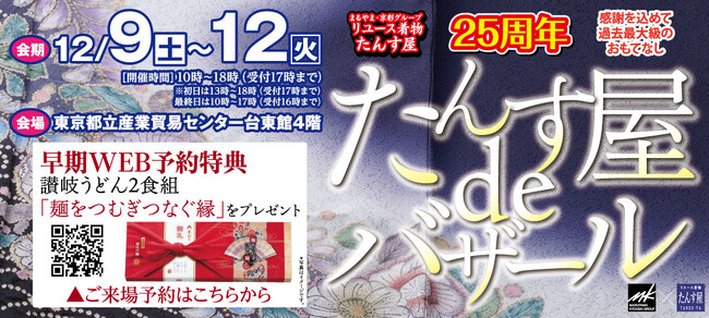 2023年12月9日(土)~2023年12月12日(火)の4日間、東京都立産業貿易センター・台東館で開催します。WEB予約で「讃岐うどん」プレゼント!