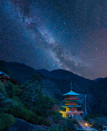 ・厳かな雰囲気の中ライトアップされた那智の滝と、那智山 青岸渡寺の三重塔を眺め、除夜の鐘を聴く