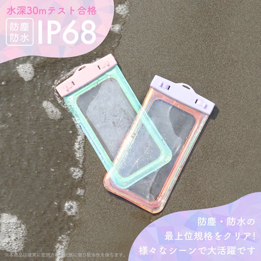 本製品は、デザイン性の高いスマートフォン用防水ケースです。スマートフォンを防水ケースに入れたままでもクリアな写真撮影が可能です。国際防水規格「IP68」を取得し、「継続的に水没しても内部に浸水することが無い(水中形)」という基準を満たす、心強い防水ケースです。フェスやキャンプ、プールでのレジャー使用や、雨の日やバスタイムでの普段使い、さまざまなシチュエーションでお使いいただけます。